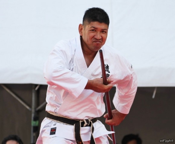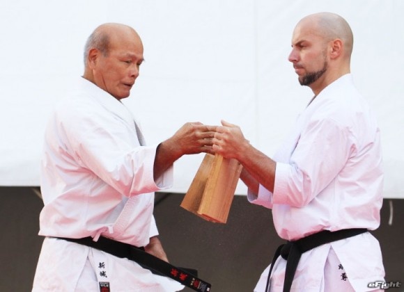 新城清秀範士9段による貫手(指先)による板2枚割り