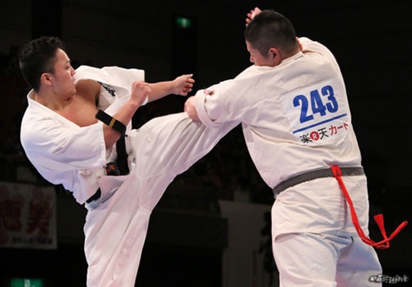 今年5月の『第2回全日本フルコンタクト空手道選手権大会』の決勝戦で、体格で大きく上回る落合(右)を破り、多くの感動を呼んだ
