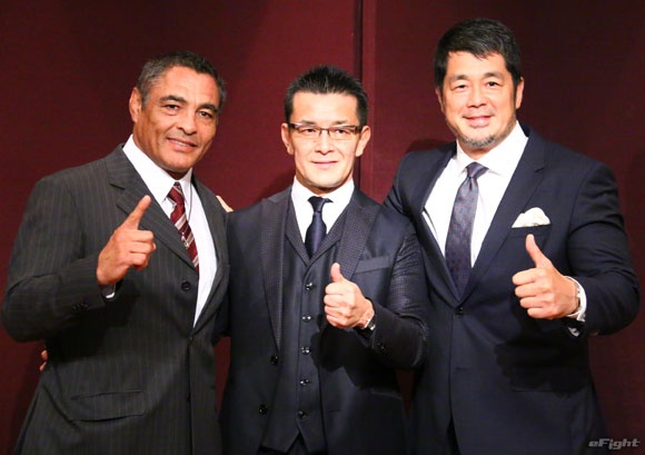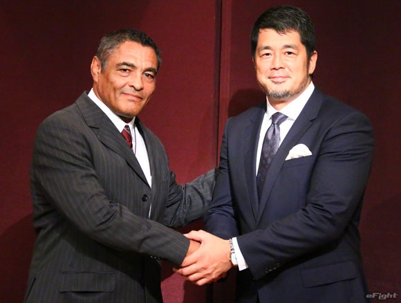 1997年10月の『PRIDE.1』で対戦したヒクソン(左)と高田延彦(右)が公の場で初めての握手