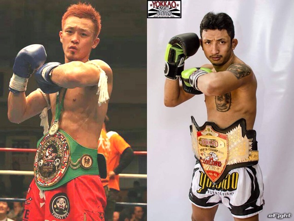 元WBCムエタイ世界スーパーライト級王者・大和哲也(左)と現ルンピニースタジアム認定ライト級王者パコーン・PKセンチャイムエタイジム(右)が対戦