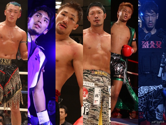 第4代Krush -63kg王座決定トーナメントに出場する(左から)泰斗、佐々木大蔵、眞暢、原田ヨシキ、南野卓幸、東本央貴