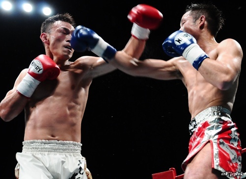 2014年9月、当時のBigbangスーパーフェザー級王者・森井洋介(左)とタイトルマッチで大激闘を繰り広げたfire(右)