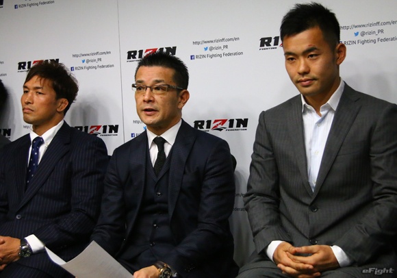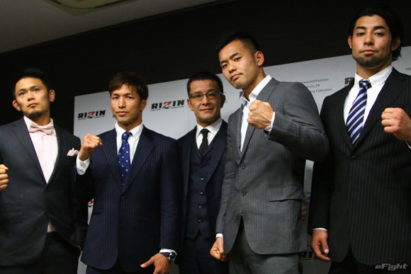 会見に出席した(左から)ウィッキー、宮田、榊原信行・RIZIN実行委員長、日菜太、長谷川