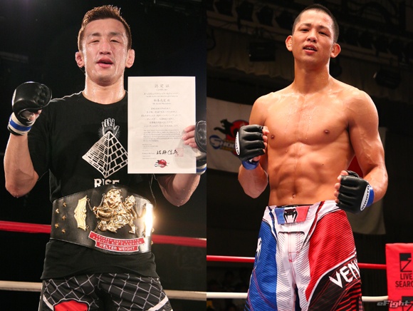 環太平洋ウェルター級チャンピオンシップで対戦する王者・松本光史(左)と挑戦者AB(右)