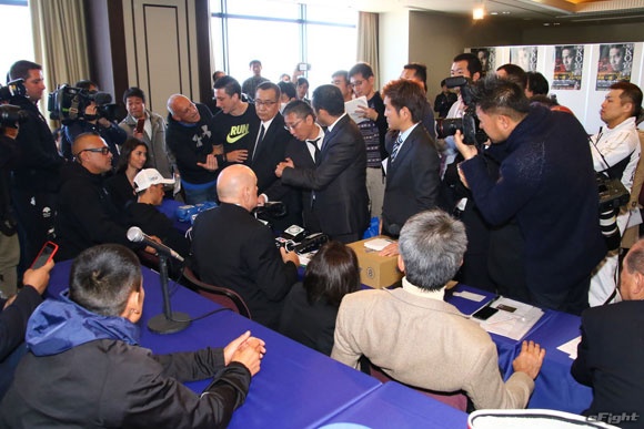使用するグローブの色をめぐって記者会見は大混乱。両陣営ゆずらず、揉めに揉めた