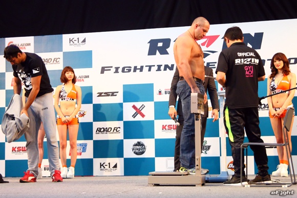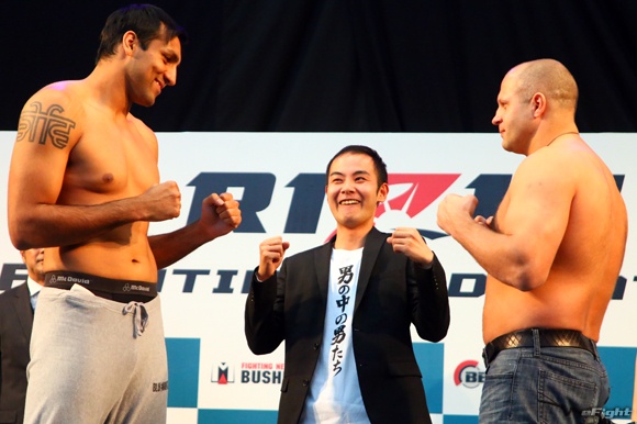 計量を終えたエメリヤーエンコ・ヒョードル(右)とシング・心・ジャディブ(左)