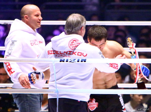 自分の試合を2日後に控えていたヒョードル(左)だが、4選手全員のセコンドに就いて勝利を喜んだ