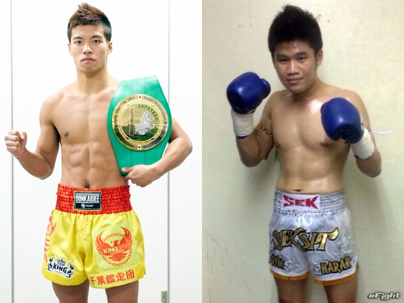 WBCムエタイ日本統一スーパーライト級王者テヨン(左)がセイサック・エスジム(右)と対戦