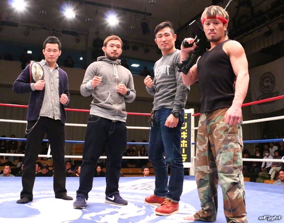 薄笑いを浮かべてにらみ合い、ランボー(右)を挑発する前田(左)