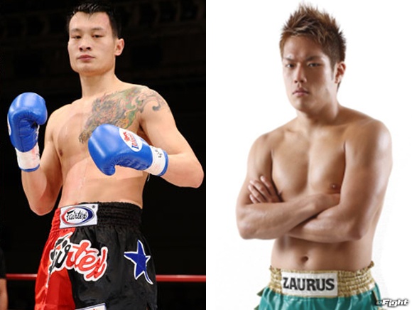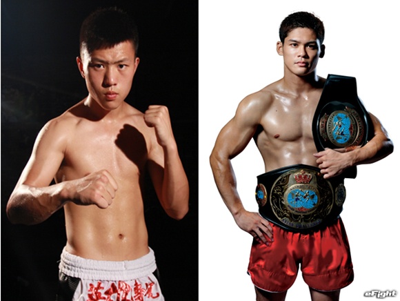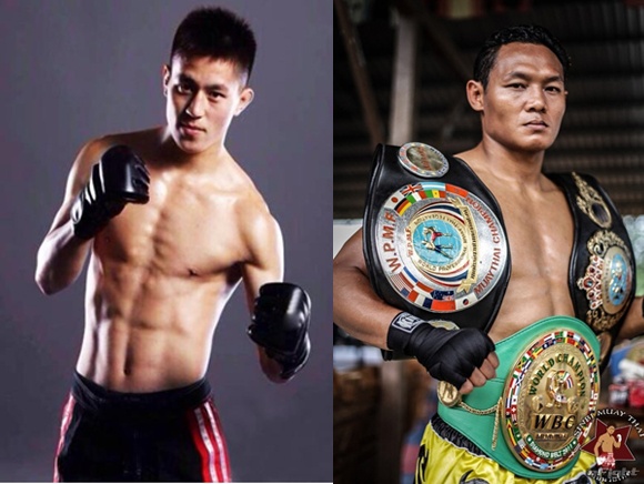 元WPMF世界スーパーフェザー級王者・中村敏射(右)は2015英雄伝説アジアチャンピオンリーグ中日64kg準優勝のヤン・ハオドン(左)と対戦