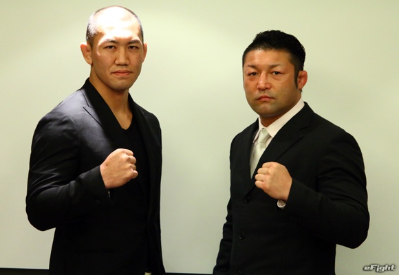 ウェルター級で対戦する岡見勇信(左)と桜井隆多(右)