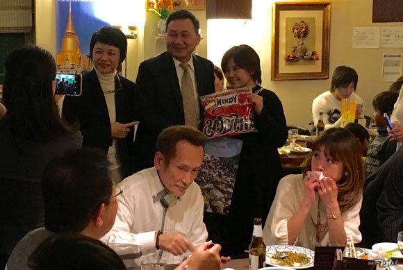 日本人選手をタイに送り込み、本場のトップ選手を日本に招聘するなどタイとの関わりが深いキングムエの佐藤会長(中央)が招かれ、ムエタイの歴史や現在などを説明した
