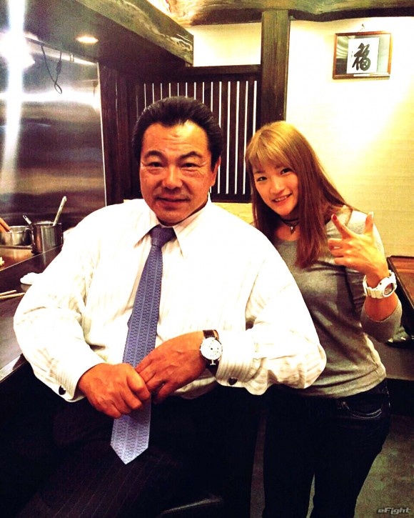 RENA(右)の祝勝会に九重親方(左)がサプライズ登場。RENAを祝福した