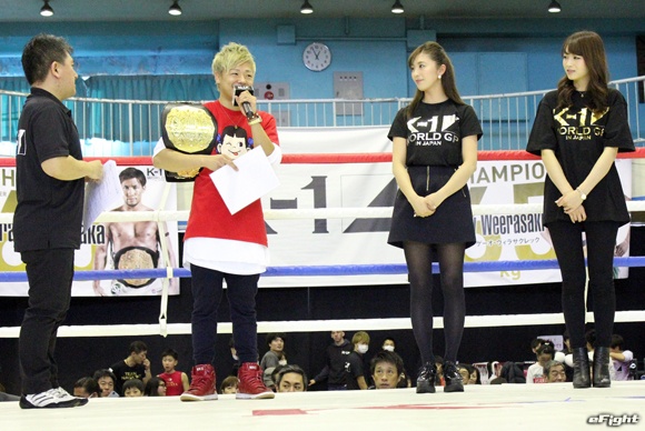 リング上で次戦への意気込みを語った武尊(左から2番目)
