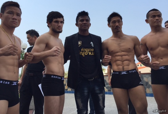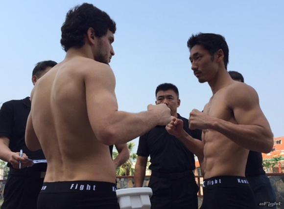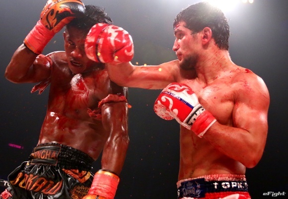 昨年7月、ブアカーオ・バンチャメーク(左)をヒジによるカットで大流血に追い込み、判定勝ちしたジャニエフ(右)