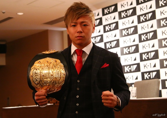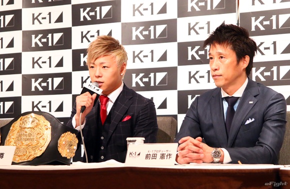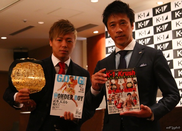 ゴング格闘技増刊として2月29日に発売される「K-1×Krush YEAR BOOK 2016」、武尊が表紙を飾った「ゴング格闘技」本誌の表紙をPRする武尊(左)と前田プロデューサー(右)