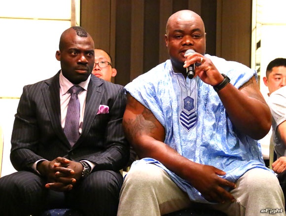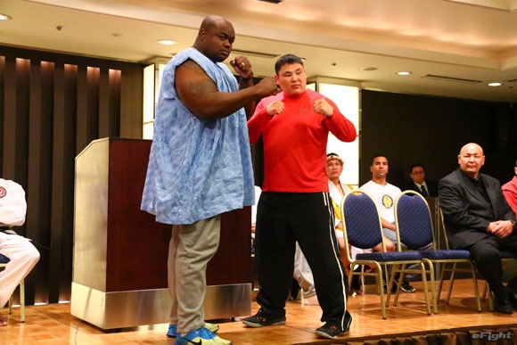 得意技はパワーだ、というマドンセラ(左)。その力こぶを見てボビーもビックリ