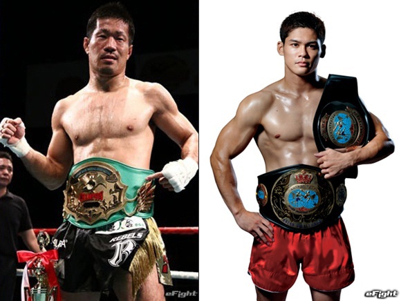 WPMF世界ミドル級王者T-98(左)と元WPMF世界スーパーフェザー級王者・中村敏射(右)