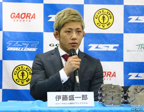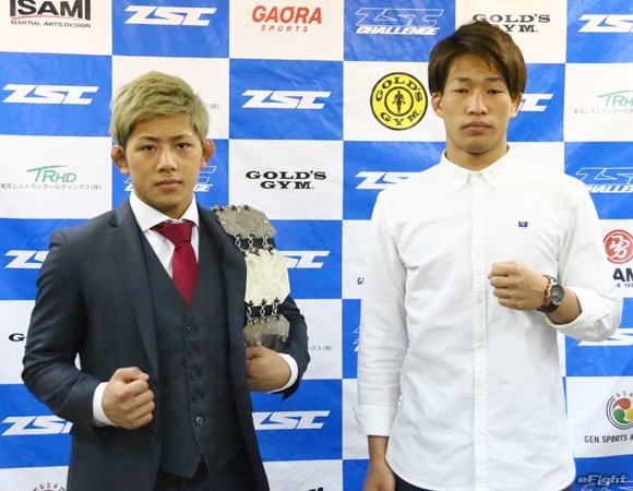 一夜明け会見に臨んだ伊藤(左)と柏崎(右)の両王者