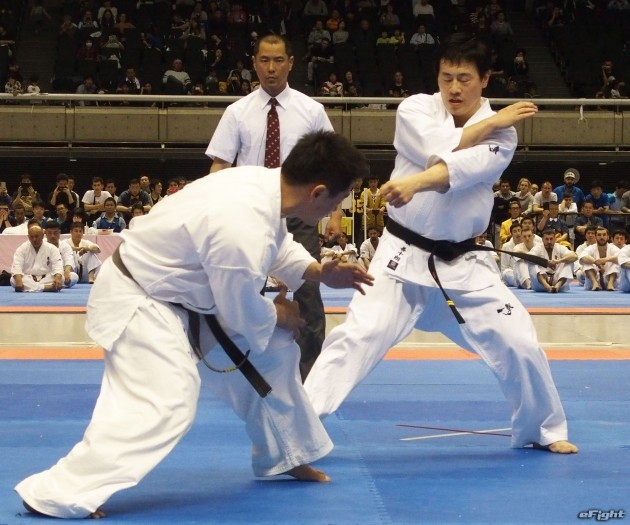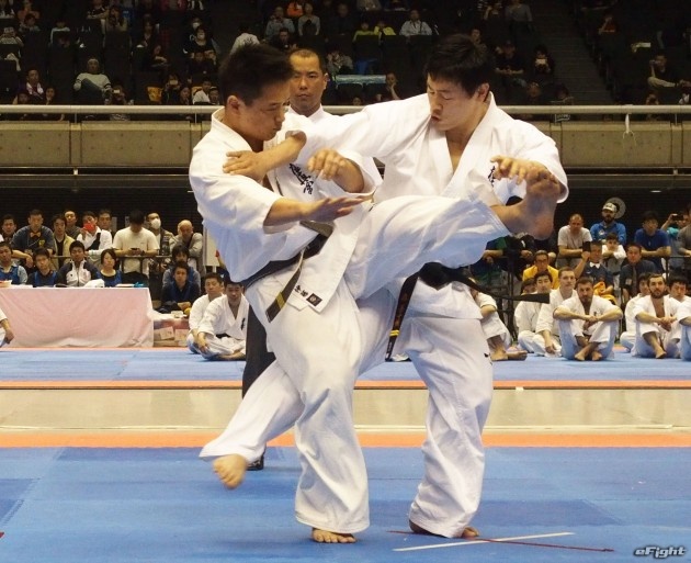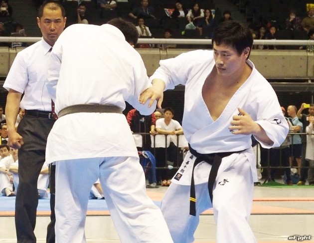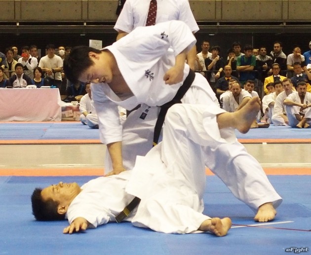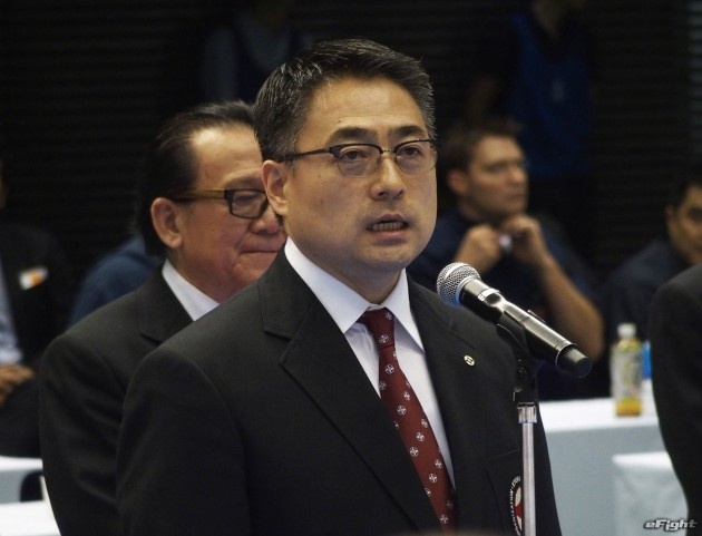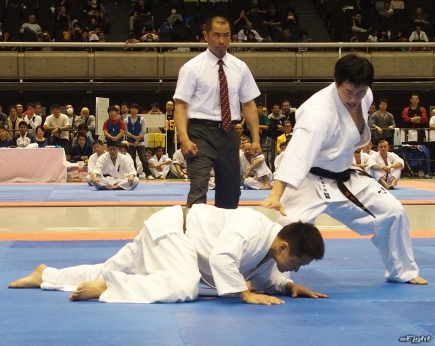これまで反則だったムエタイでよく見られる手で押しての足払いも有効となった。技をかけるのは世界中量級王者の森善十郎。