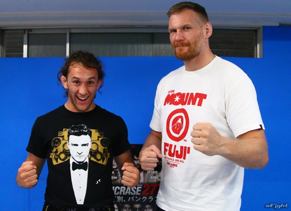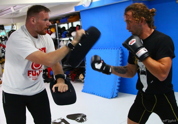 師匠ジョシュ・バーネット(左)が持つミットにパンチを叩きこむヘンリー(右)