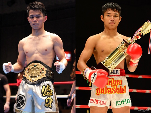 J-NETWORKスーパーライト級王者・岩崎悠斗(左)が参戦、サクーンチャイ・エクシンディコンジム(右)と対戦
