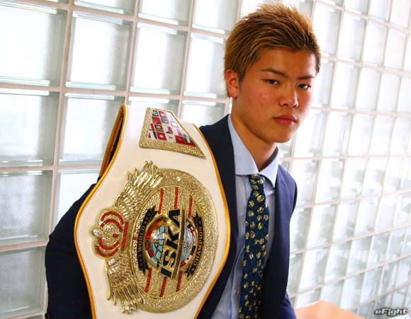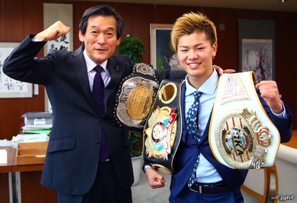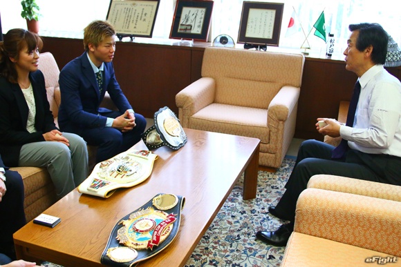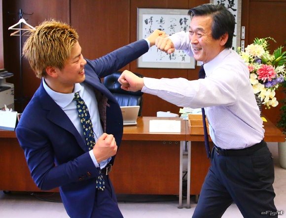松戸市役所の本郷谷健次市長(左)を表敬訪問した那須川天心(右)