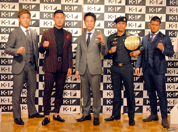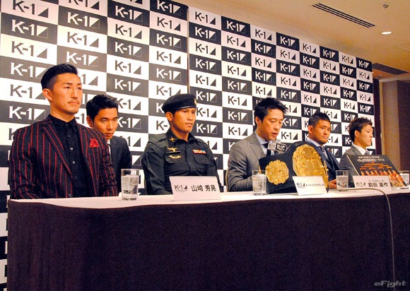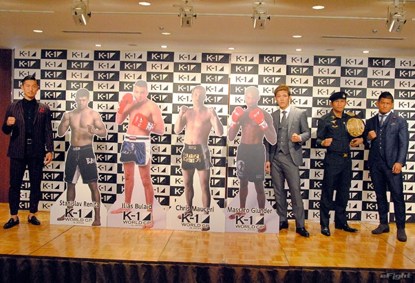 (左から)山崎、レニタ、ブライド、マセーリ、グランダー、野杁、ゲーオ、HIROYA。ゲーオ以外の外国人選手はパネルが用意された