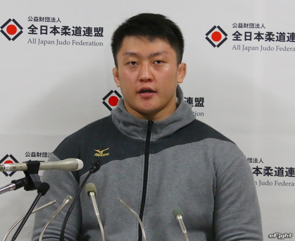 選手権では準決勝で敗退し厳しい表情で会見に臨む柔道男子100kg超級日本代表の原沢