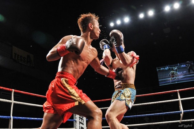 REBELSスーパーライト級王者ハチマキに挑戦する渡辺理想(左)