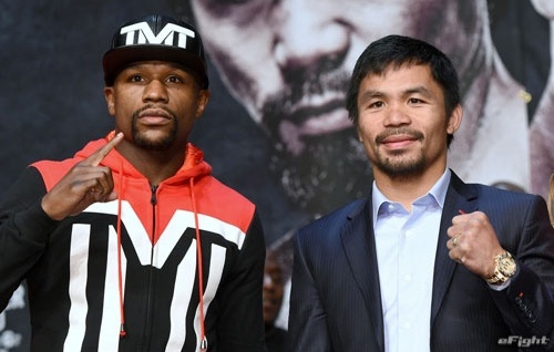 2015年5月の対戦前に、会見に出席したメイウェザー(左)とパッキャオ(右)