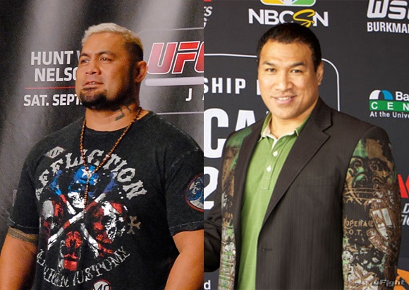 レスナー戦を前に盟友セフォー(右)の元を訪れたハント(左)