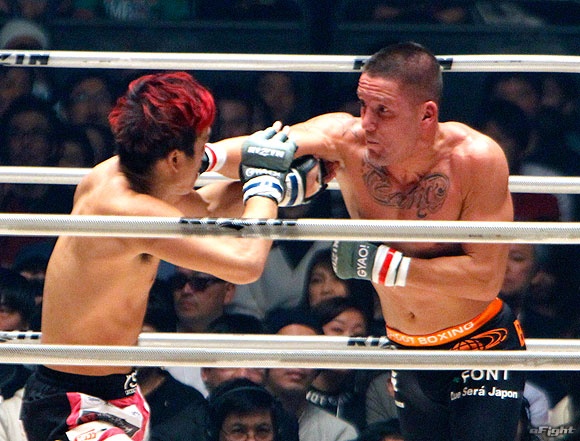 RIZINでMMAデビュー戦をKO勝ちで飾ったサワー(右)。第2戦は中国で行う