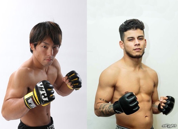 修斗フライ級8位の猿田(左)が英国人ファイターのゴンザレス(右)との初の国際戦