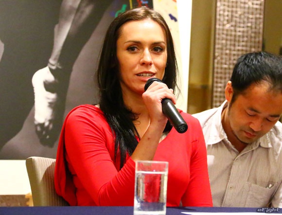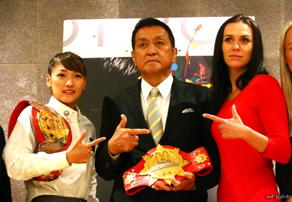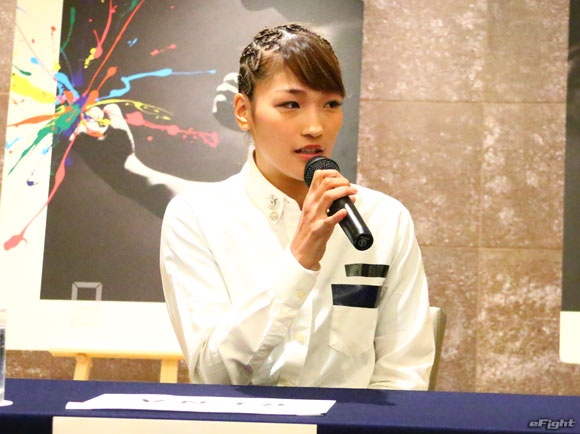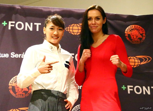 挑戦者クラウディア(右)と初めて顔を合わせたRENA(左)は「思ったよりも身長が高い」