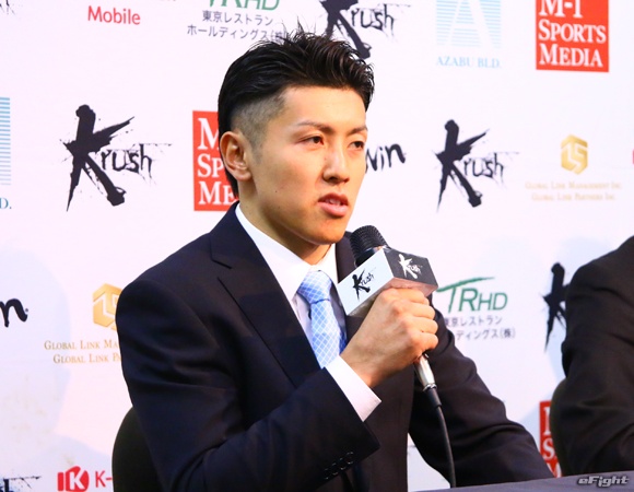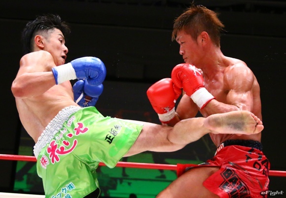 強烈な右ミドルを牧平(右)に見舞う山際(左)