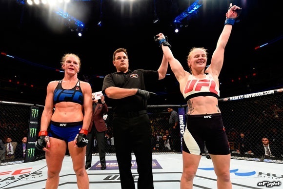はボクシング三階級制覇の強打者ホルム(右)を相手に打ち合うシェフチェンコ(左)