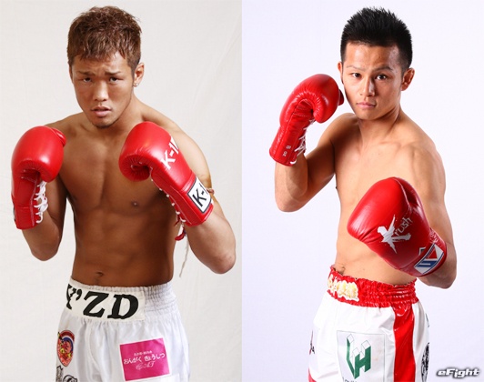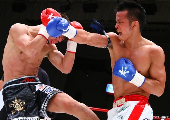 ハードパンチャーの明戸仁志(左)と果敢に打ち合う郷州(右)