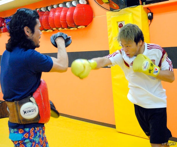 武尊(右)がミット打ちのデモンストレーションを行う