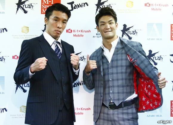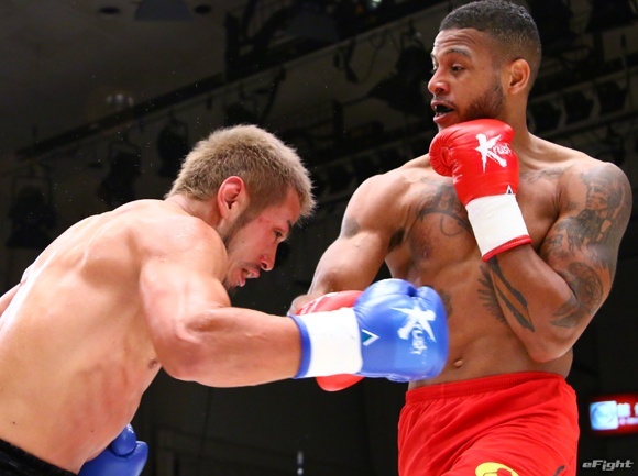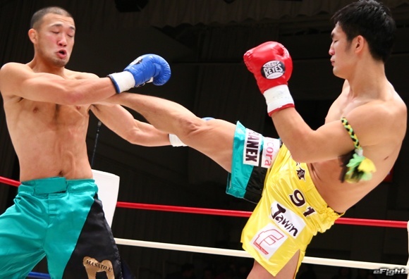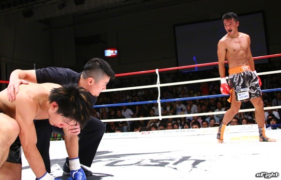 山崎陽一(左)をなぎ倒し、豪快KOで初防衛に成功したピケオー(右)