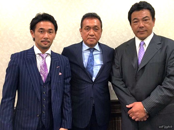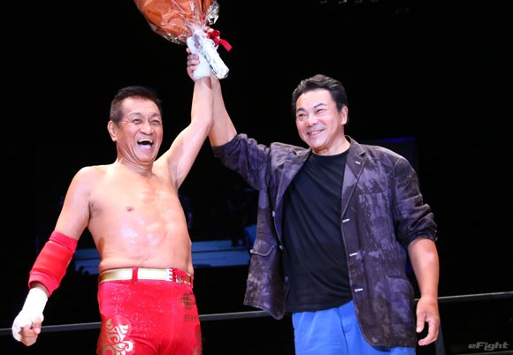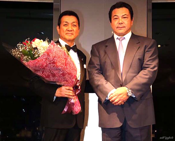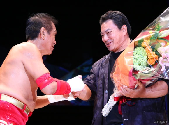 シーザー会長の還暦試合に、九重親方が花束を持って駆けつけた。九重親方は手術後だった