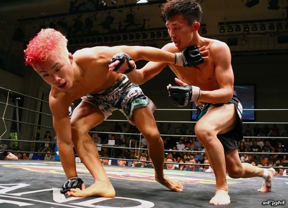 第4代DEEPフライ級王者決定戦で和田竜光(右)と戦う柴田(左)