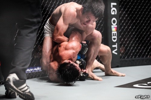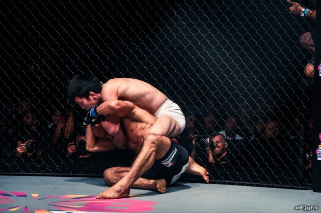 初防衛戦で青木はバックからスリーパーを極めて圧勝