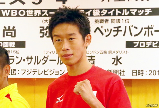 同日に試合を行う井上拓真(左)、井上尚弥(中央)とともにポーズをキメた清水