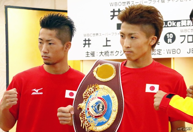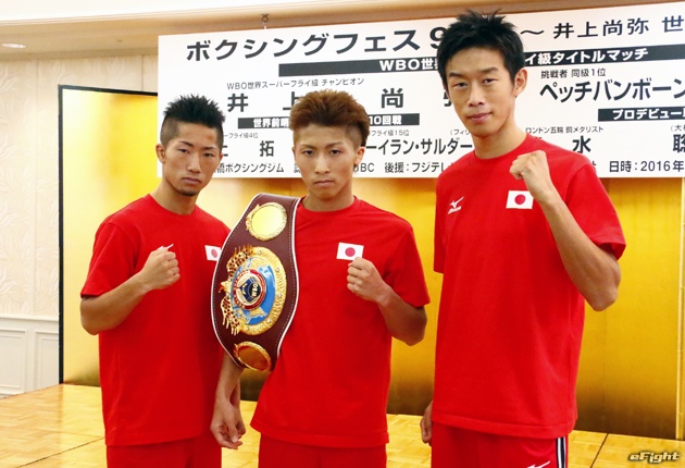 兄の尚弥(中央)、清水聡(右)とともに必勝を誓った井上拓真(左)