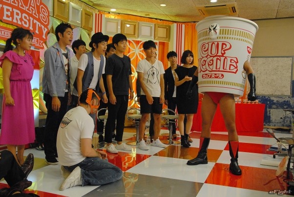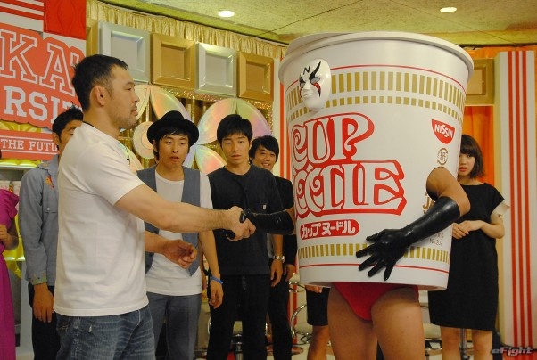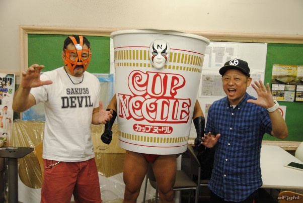 桜庭、カップヌードル大帝、そしてカップヌードル大帝生みの親である漫画家ゆでたまごの嶋田隆司さん