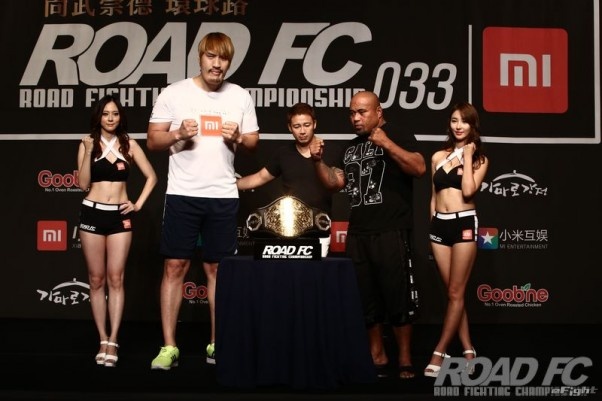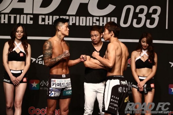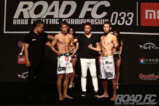 計量を終えた上迫博仁(右)と対戦相手のホン・ヨンギ(左)