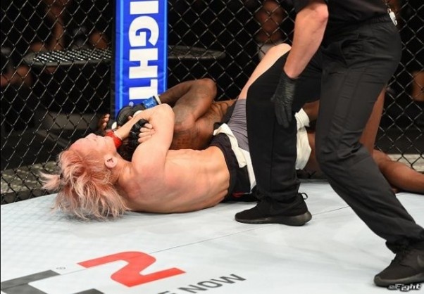 5月大会でUFC2勝目をあげた佐々木(右)。この試合後にはUFCフライ級王者デメトリアス・ジョンソンに宣戦布告した