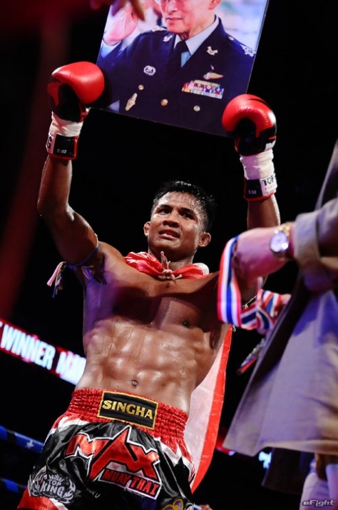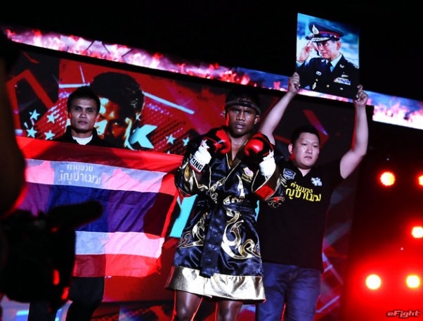 タイの国旗、プミポン国王の写真とともに入場するブアカーオ
