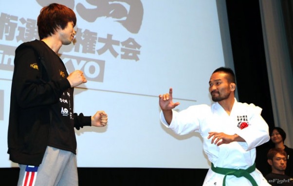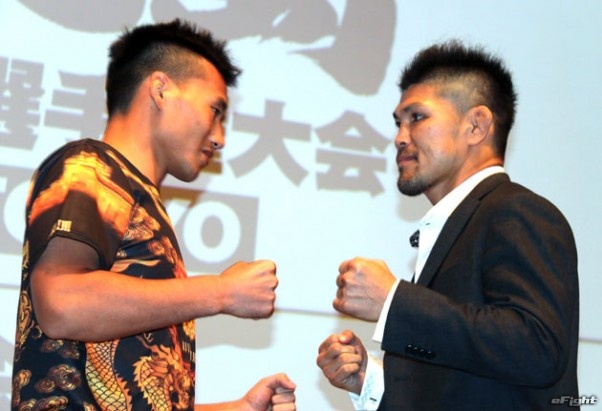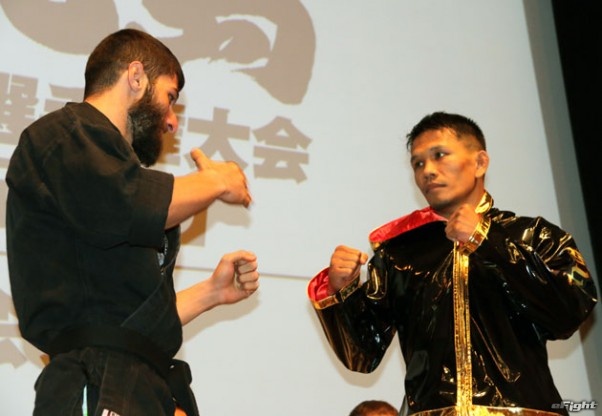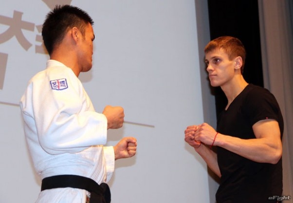 巴投げからのパウンドを予告した小見川(右)と中国武術・散打の張(左)